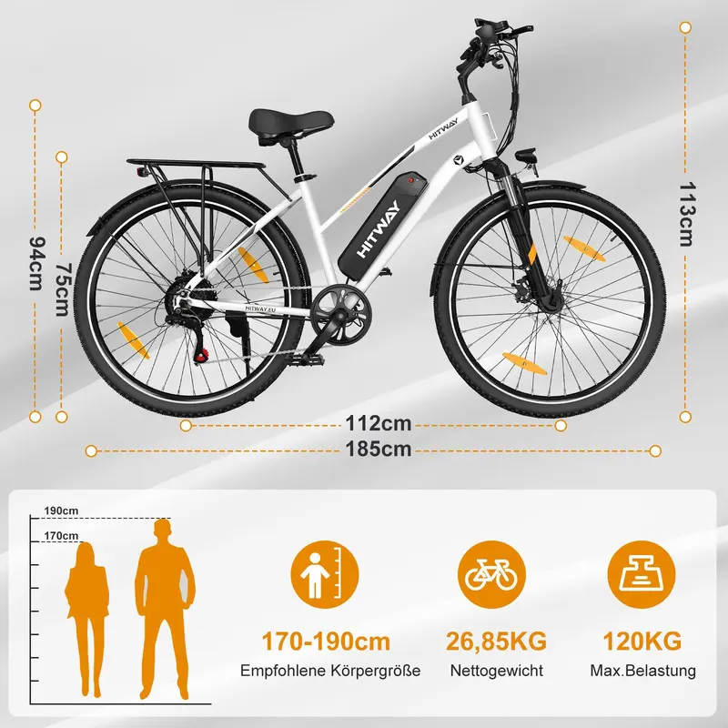 • PERFEKTES STADTRADELN-Dieses elektrische Stadtrad eignet sich nicht nur für den taglichen Gebrauch, den Weg zur Arbeit, sondern auch für langere Tagesausflüge. HITWAY hat sich verpflichtet, Ihnen ein reibungsloses Fahrerlebnis zu bieten und Ihnen die