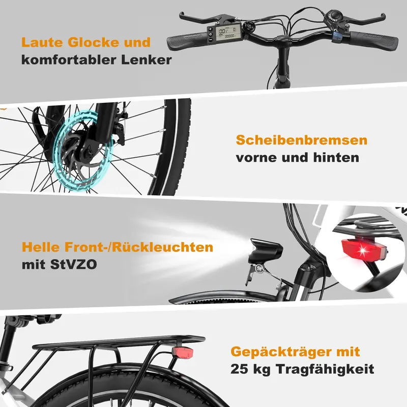 Scheinwerfer (StVzO-konform), das Rücklicht und die Reflexionsstreifen sorgen für maximale Sichtbarkeit und ermoglichen eine sichere Fahrt bei Nacht.